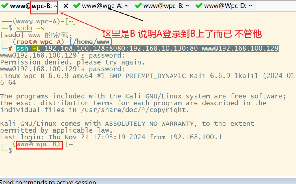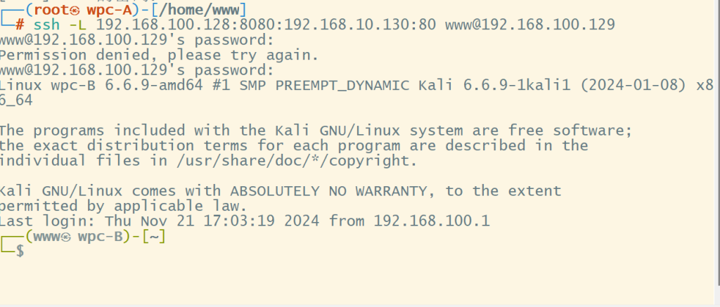 ssh -L 192.168.100.128:8080:192.168.10.130:80 www@192.168.100.129