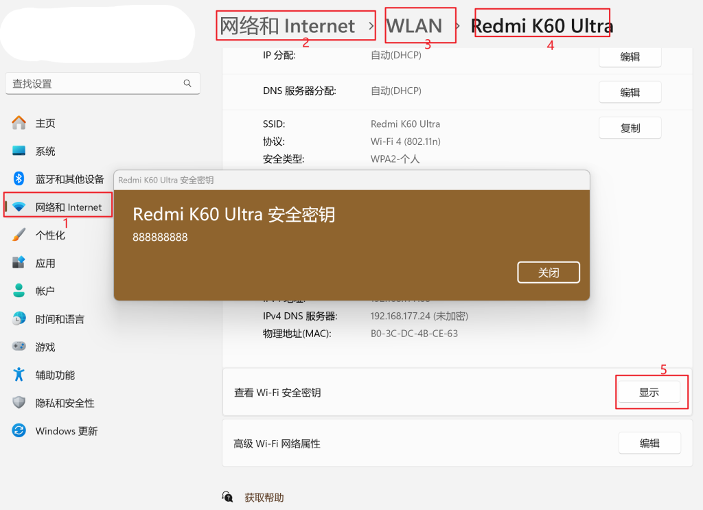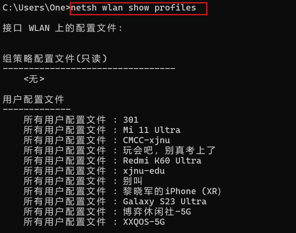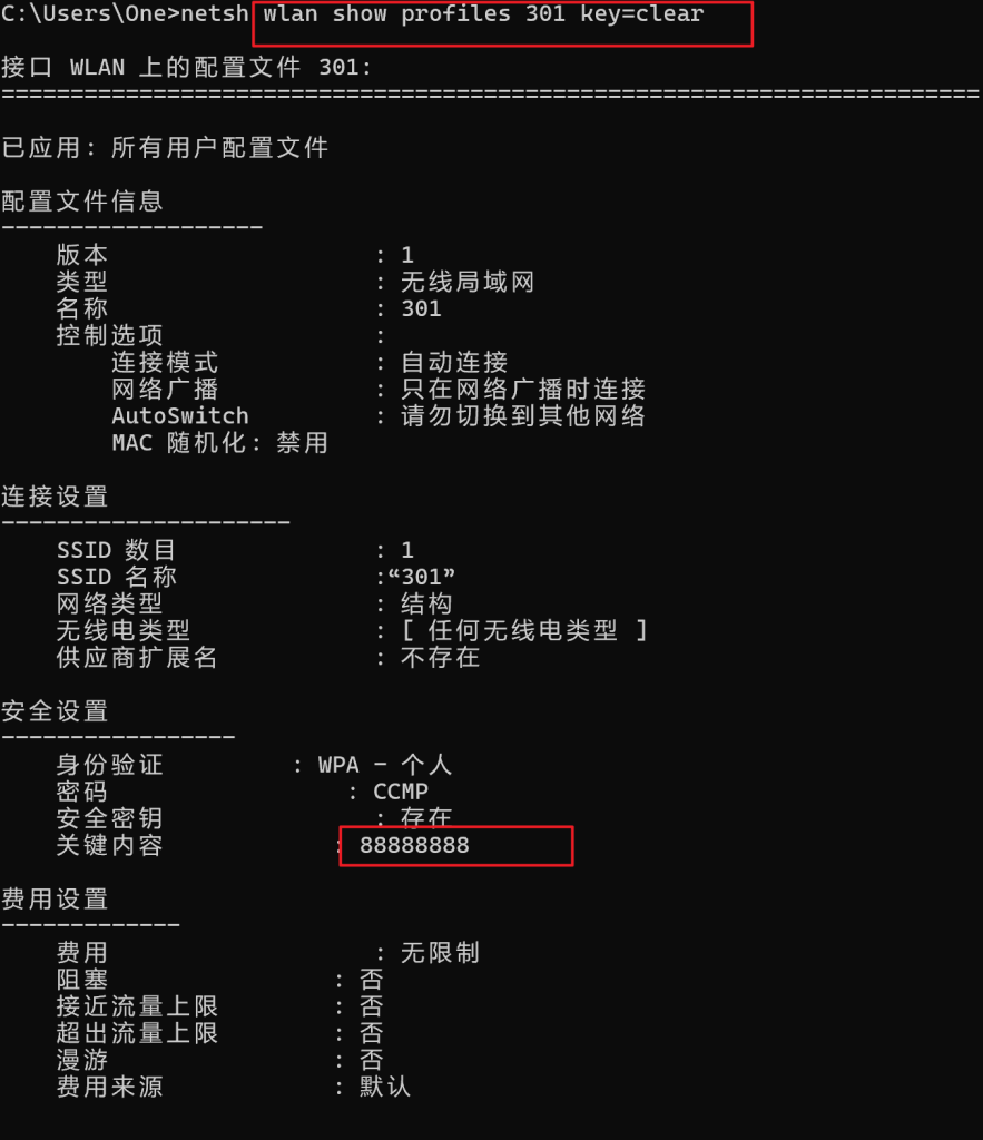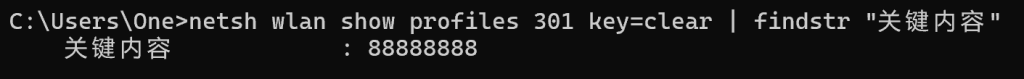 netsh wlan show profiles 301 key=clear | findstr "关键内容"
